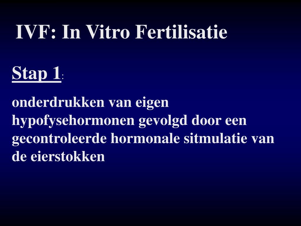 IVF: In Vitro Fertilisatie Stap 1: onderdrukken van eigen hypofysehormonen gevolgd door een gecontroleerde hormonale sitmulatie van de eierstokken