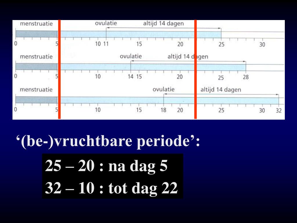 ‘(be-)vruchtbare periode’: 25 – 20 : na dag 5 32 – 10 : tot dag 22