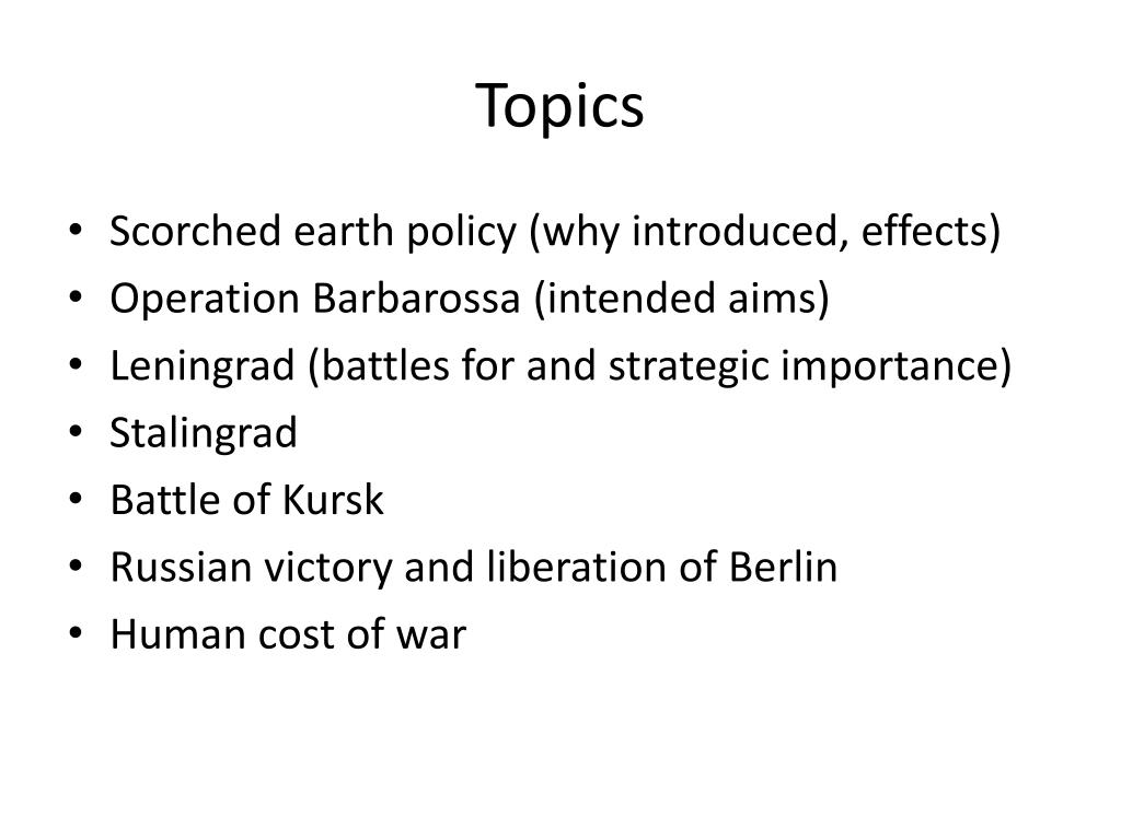 Topics • Scorched earth policy (why introduced, effects) • Operation Barbarossa (intended aims) • Leningrad (battles for and strategic importance) • Stalingrad • Battle of Kursk • Russian victory and liberation of Berlin • Human cost of war