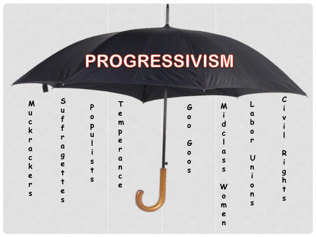 PROGRESSIVISM CivilRights Suffragettes Muckrackers Temperance Labor Unions MidclassWomen Popul ists Goo Goos