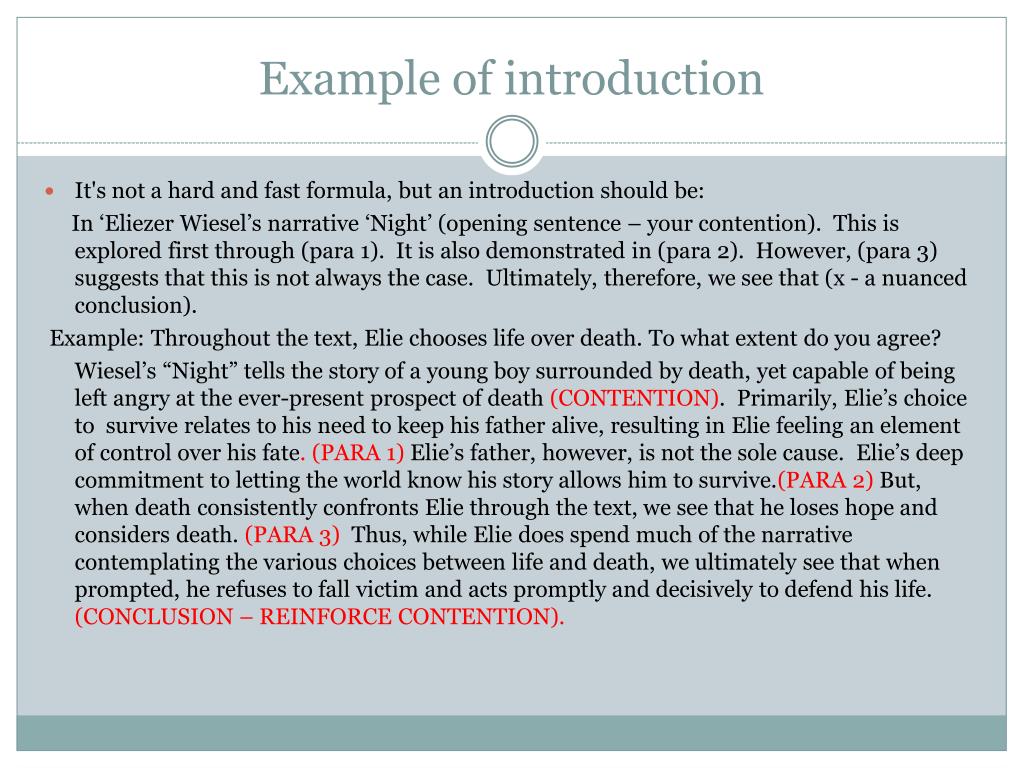 Example of introduction It's not a hard and fast formula, but an introduction should be: In ‘Eliezer Wiesel’s narrative ‘Night’ (opening sentence – your contention). This is explored first through (para 1). It is also demonstrated in (para 2). However, (para 3) suggests that this is not always the case. Ultimately, therefore, we see that (x - a nuanced conclusion). Example: Throughout the text, Elie chooses life over death. To what extent do you agree? Wiesel’s “Night” tells the story of a young boy surrounded by death, yet capable of being left angry at the ever-present prospect of death (CONTENTION). Primarily, Elie’s choice to survive relates to his need to keep his father alive, resulting in Elie feeling an element of control over his fate. (PARA 1) Elie’s father, however, is not the sole cause. Elie’s deep commitment to letting the world know his story allows him to survive.(PARA 2) But, when death consistently confronts Elie through the text, we see that he loses hope and considers death. (PARA 3) Thus, while Elie does spend much of the narrative contemplating the various choices between life and death, we ultimately see that when prompted, he refuses to fall victim and acts promptly and decisively to defend his life. (CONCLUSION – REINFORCE CONTENTION).