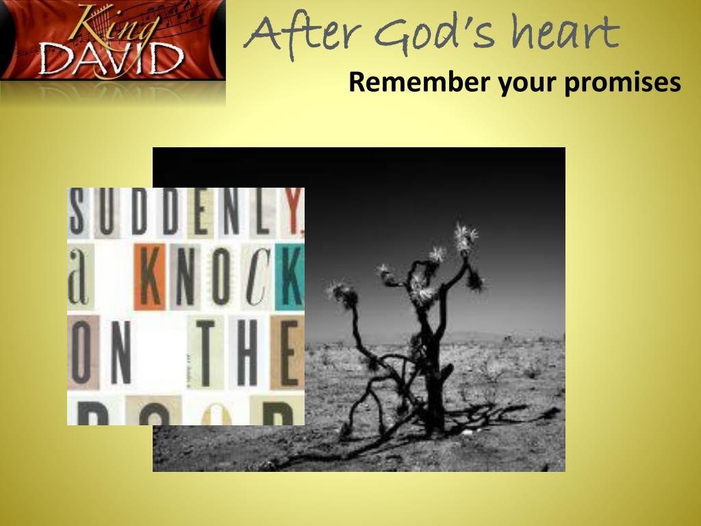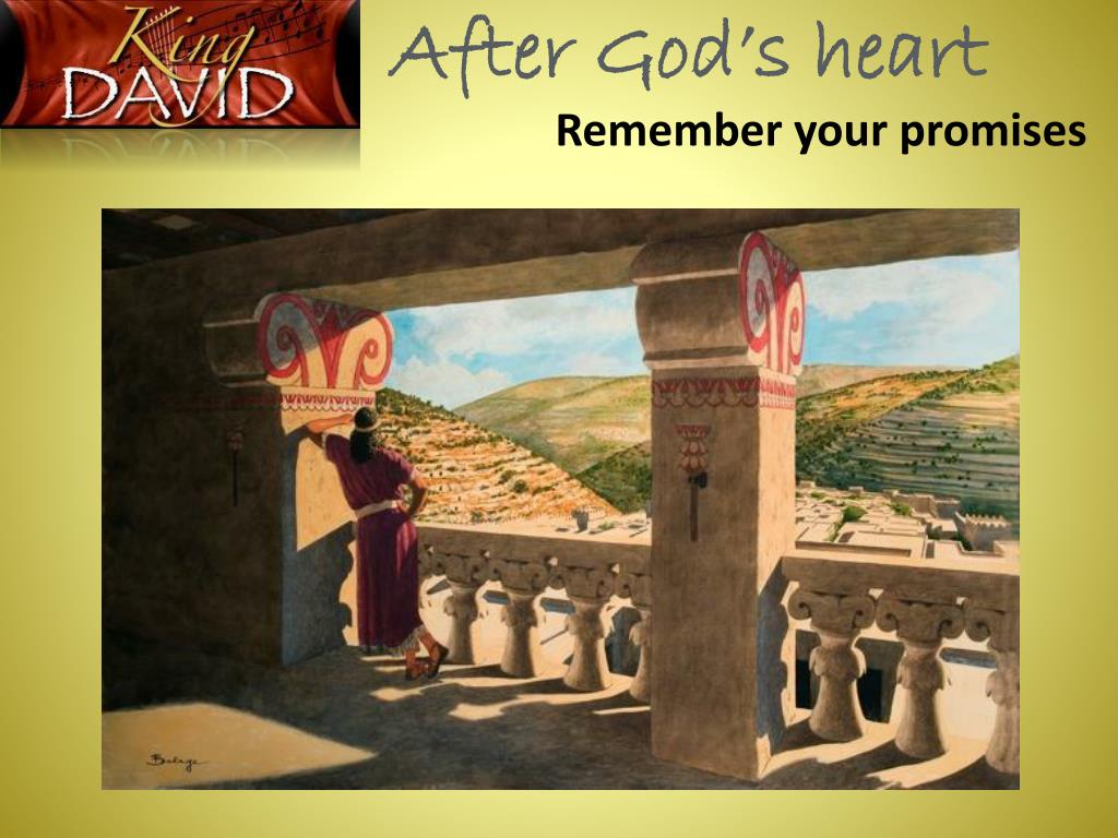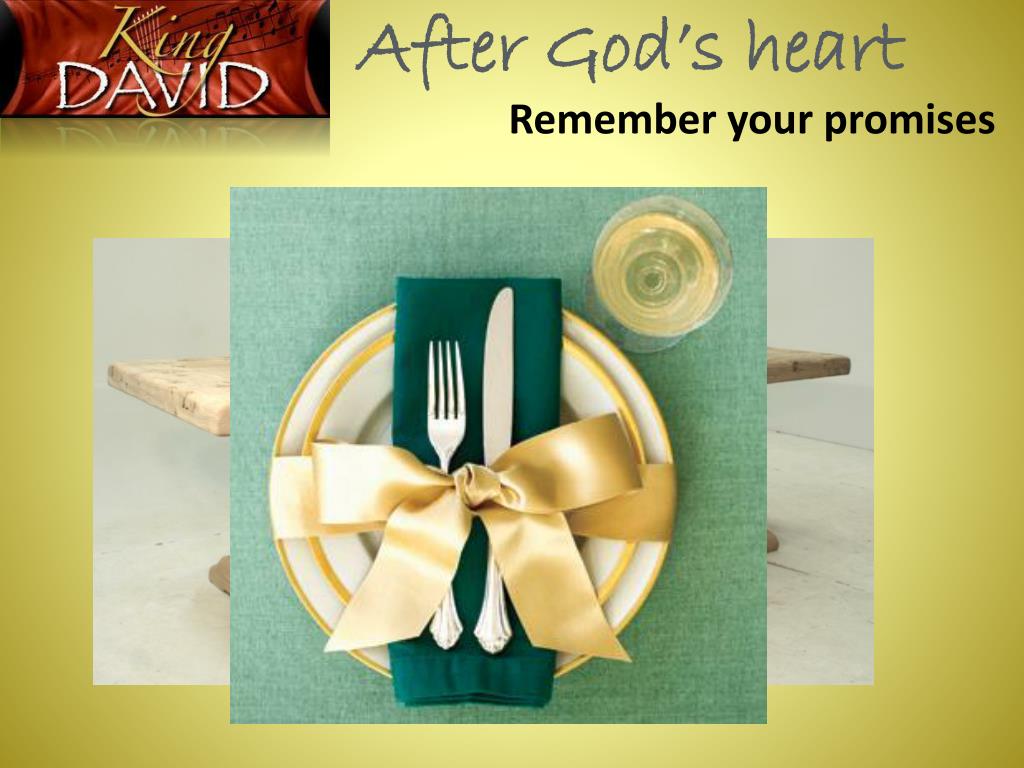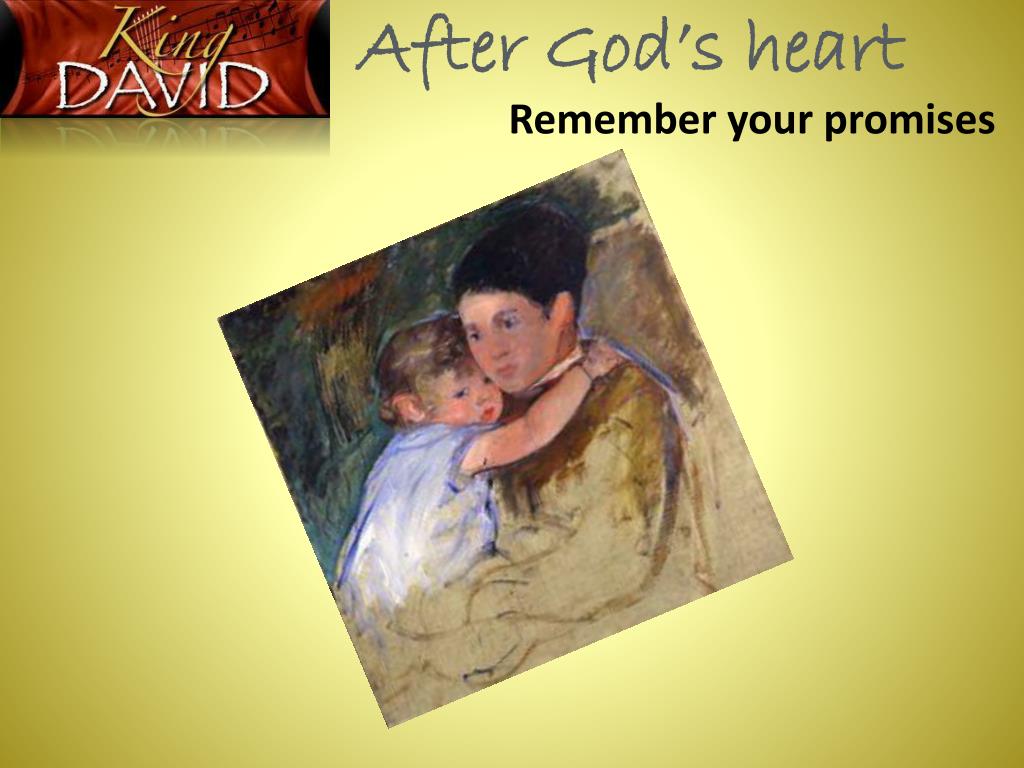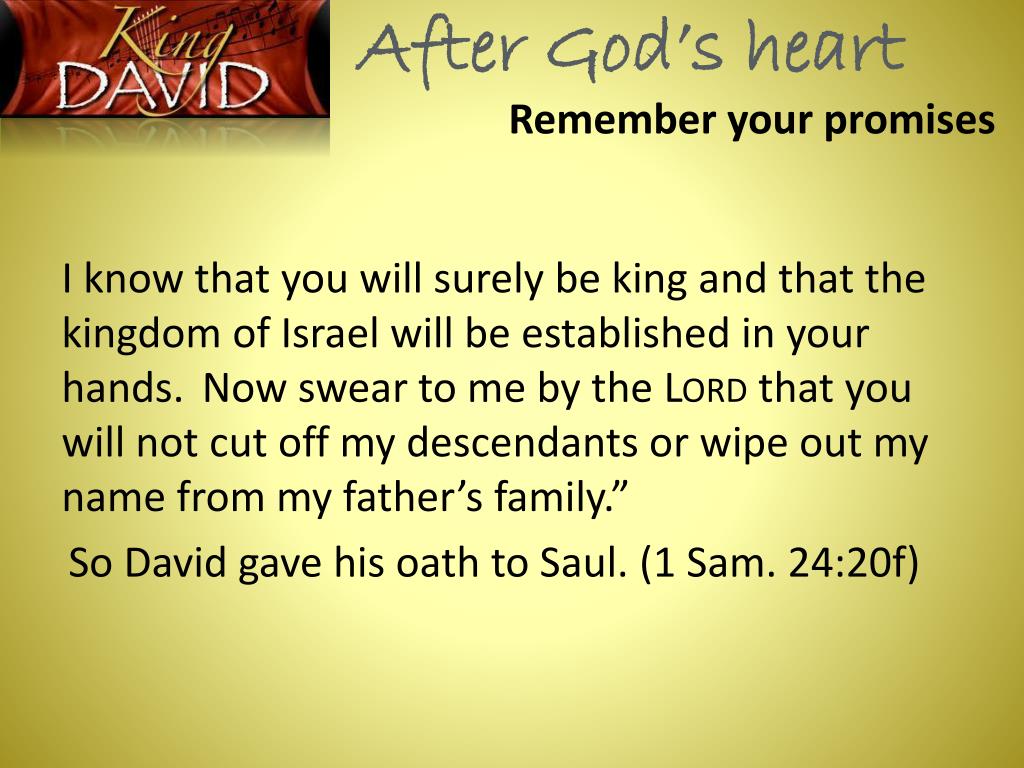 After God’s heart Remember your promises I know that you will surely be king and that the kingdom of Israel will be established in your hands. Now swear to me by the Lord that you will not cut off my descendants or wipe out my name from my father’s family.” So David gave his oath to Saul. (1 Sam. 24:20f)