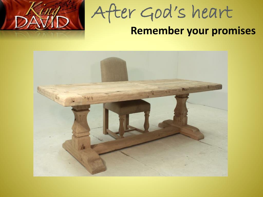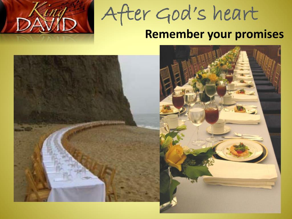 After God’s heart Remember your promises Zibaanswered theKing… (4) When Mephibosheth…came to David… David said, “Mephibosheth!” “Your servant,” he replied. “Don’t be afraid,” David said to him…(6-7) The King summoned Ziba (9) …Ziba said to the king…“Your servant will do whatever my lord the king commands his servant to do.” So Mephibosheth ate at David’s table like one of the king’s sons. (11)