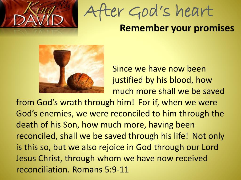 After God’s heart Remember your promises Since we have now been justified by his blood, how much more shall we be saved from God’s wrath through him! For if, when we were God’s enemies, we were reconciled to him through the death of his Son, how much more, having been reconciled, shall we be saved through his life! Not only is this so, but we also rejoice in God through our Lord Jesus Christ, through whom we have now received reconciliation. Romans 5:9-11