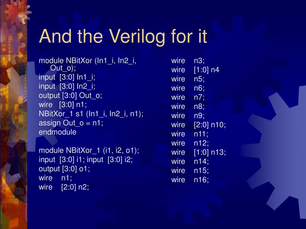 wire n17; wire n18; wire [1:0] n19; wire [2:0] n20; wire [3:0] n21; assign n1 = i1[0]; assign n2 = {i1[3], i1[2], i1[1]}; assign n3 = n2[0]; assign n4 = {n2[2], n2[1]}; assign n5 = n4[0]; assign n6 = n4[1]; assign n7 = n6; assign n8 = i2[0]; assign n9 = n1 ^ n8; assign n10 = {i2[3], i2[2], i2[1]}; assign n11 = n10[0]; assign n12 = n3 ^ n11; assign n13 = {n10[2], n10[1]}; assign n14 = n13[0]; assign n15 = n5 ^ n14; assign n16 = n13[1]; assign n17 = n16; assign n18 = n7 ^ n17; assign n19 = {n18, n15}; assign n20 = {n19, n12}; assign n21 = {n20, n9}; assign o1 = n21; endmodule And the Verilog for it (Cont’d)