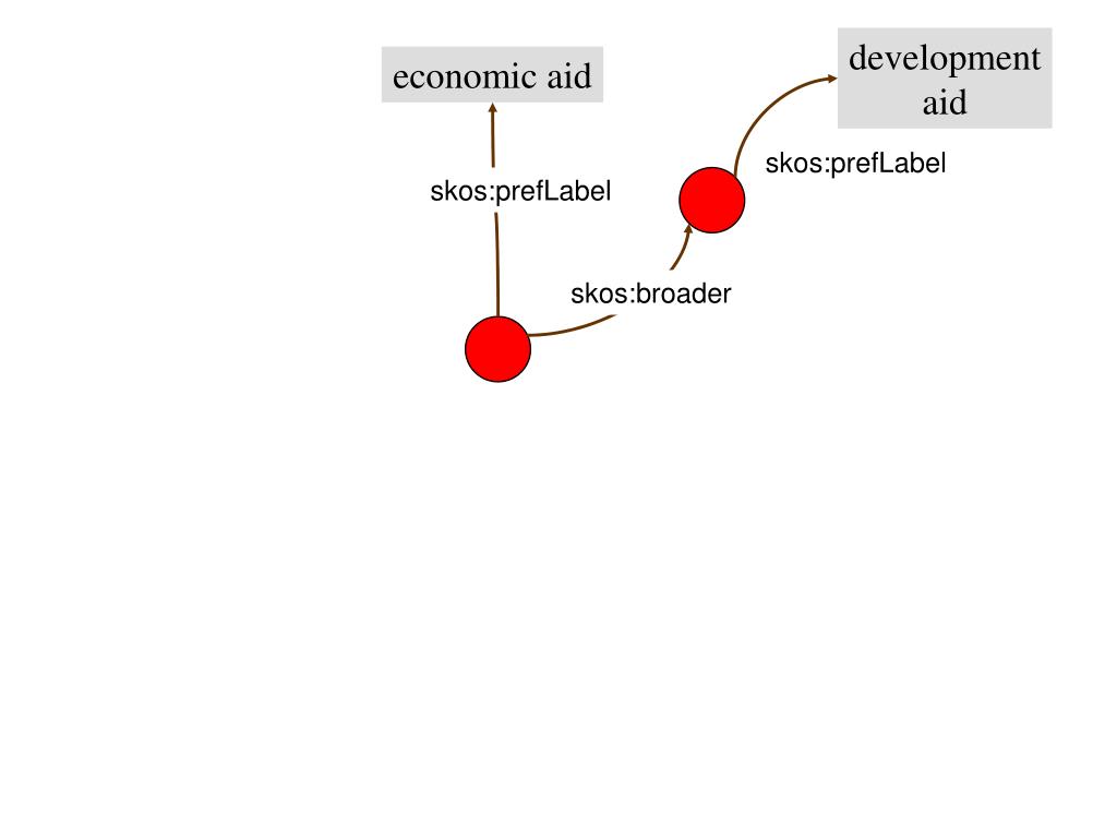 <rdf:RDF xmlns:rdf="http://www.w3.org/1999/02/22-rdf-syntax-ns#" xmlns:skos="http://www.w3.org/2004/02/skos/core#"><rdf:type rdf:resource="http://www.w3.org/2004/02/skos/core#Concept"/> <skos:Concept rdf:about=" http://foobar.org/thes/7021"> <skos:prefLabel xml-lang=“en”>economic aid</skos:prefLabel> <skos:altLabel xml-lang=“en”>economic assistance</skos:altLabel> <skos:prefLabel xml-lang=“fr”>aide économique</skos:prefLabel> <skos:altLabel xml-lang=“fr”>aide financière</skos:altLabel> <skos:scopeNote xml-lang=“en”>Use for aid at international level.</skos:scopeNote> <skos:broader rdf:resource=" http://foobar.org/thes/8013" /> <skos:narrower rdf:resource=" http://foobar.org/thes/3024" /> <skos:related rdf:resource=" http://foobar.org/thes/3024" /> </skos:Concept>