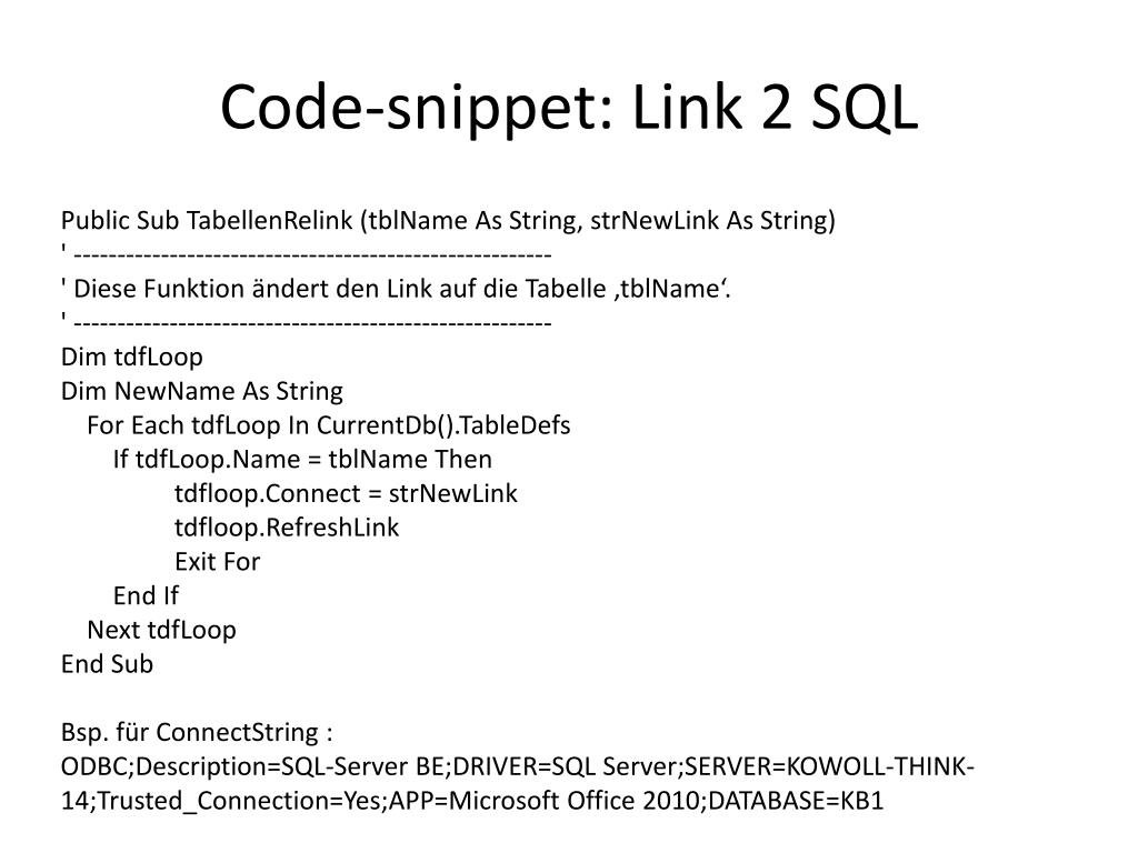 Code-snippet: Link 2 SQL Public Sub TabellenRelink (tblNameAs String, strNewLink As String) ' ------------------------------------------------------- ' Diese Funktion ändert den Link auf die Tabelle ‚tblName‘. ' ------------------------------------------------------- DimtdfLoop DimNewName As String ForEachtdfLoop In CurrentDb().TableDefs IftdfLoop.Name = tblNameThen tdfloop.Connect = strNewLink tdfloop.RefreshLink Exit For End If Next tdfLoop End Sub Bsp. für ConnectString : ODBC;Description=SQL-Server BE;DRIVER=SQL Server;SERVER=KOWOLL-THINK-14;Trusted_Connection=Yes;APP=Microsoft Office 2010;DATABASE=KB1