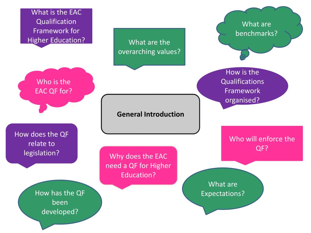 What are benchmarks? What is the EAC Qualification Framework for Higher Education? What are the overarching values? Who is the EAC QF for? How is the Qualifications Framework organised? General Introduction How does the QF relate to legislation? Who will enforce the QF? Why does the EAC need a QF for Higher Education? What are Expectations? How has the QF been developed?