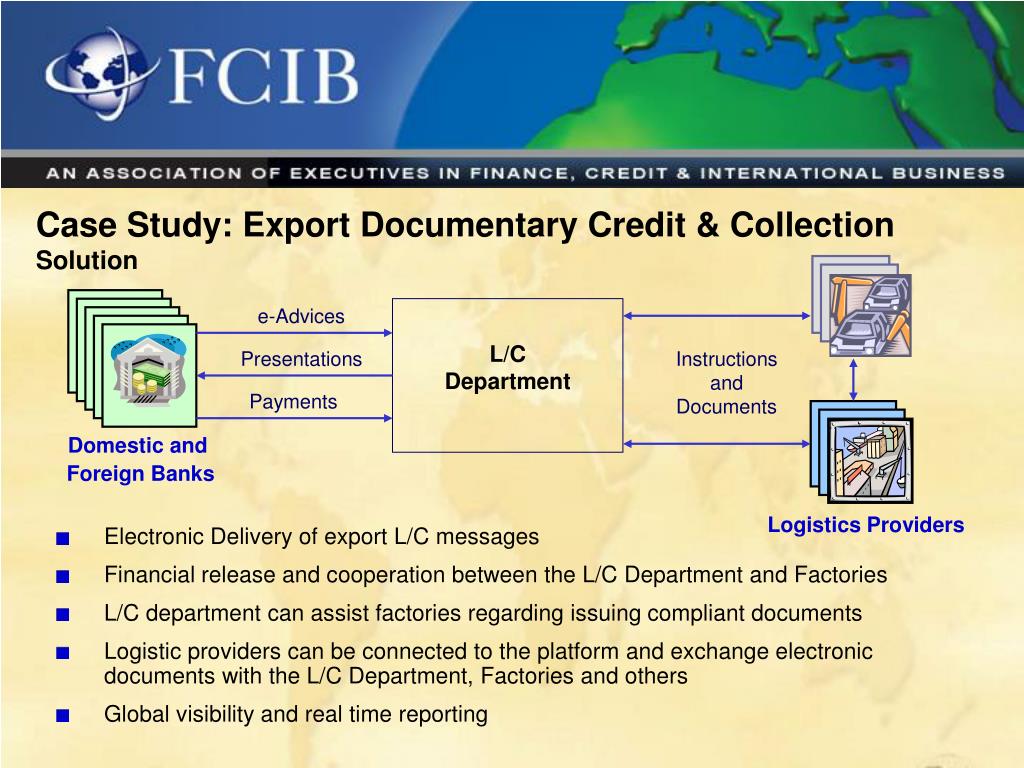 Case Study: Export Documentary Credit & Collection Solution e-Advices L/C Department Presentations Instructions and Documents Payments Domestic and Foreign Banks Logistics Providers Electronic Delivery of export L/C messages Financial release and cooperation between the L/C Department and Factories L/C department can assist factories regarding issuing compliant documents Logistic providers can be connected to the platform and exchange electronic documents with the L/C Department, Factories and others Global visibility and real time reporting
