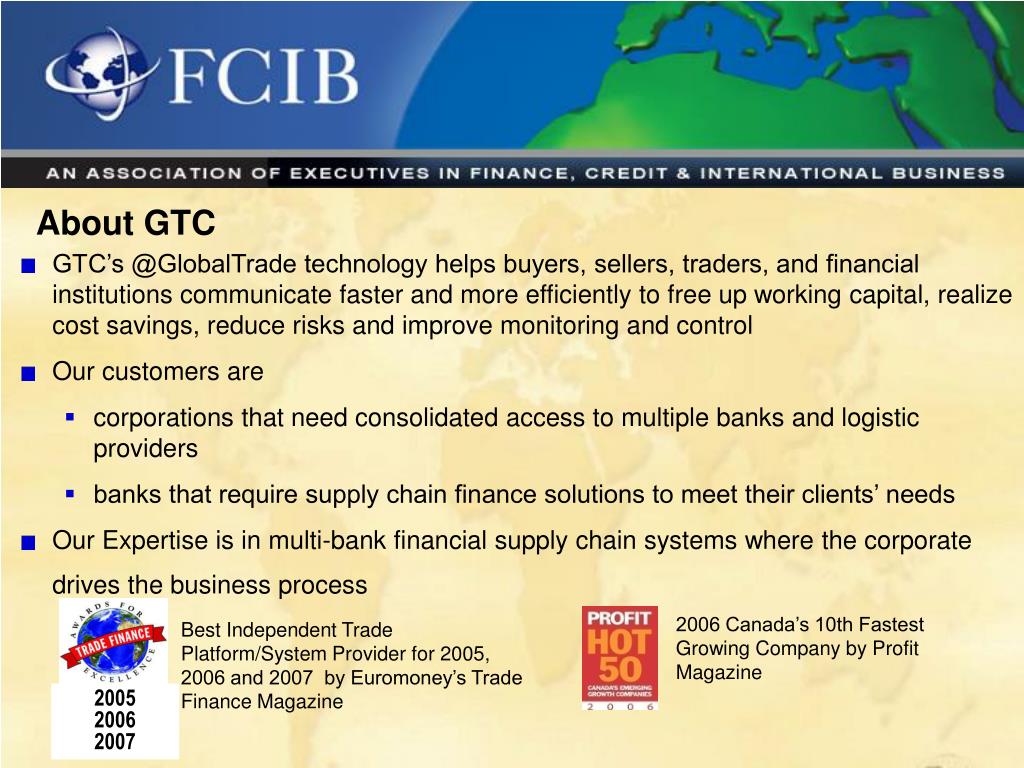 About GTC • GTC’s @GlobalTrade technology helps buyers, sellers, traders, and financial institutions communicate faster and more efficiently to free up working capital, realize cost savings, reduce risks and improve monitoring and control • Our customers are • corporations that need consolidated access to multiple banks and logistic providers • banks that require supply chain finance solutions to meet their clients’ needs • Our Expertise is in multi-bank financial supply chain systems where the corporate drives the business process 2006 Canada’s 10th Fastest Growing Company by Profit Magazine Best Independent Trade Platform/System Provider for 2005, 2006 and 2007 by Euromoney’s Trade Finance Magazine 2005 2006 2007