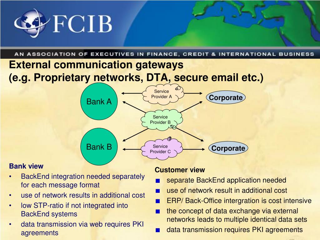 External communication gateways (e.g. Proprietary networks, DTA, secure email etc.) Bank A Service Provider A Corporate Service Provider B Bank B Service Provider C Corporate • Bank view • BackEnd integration needed separately for each message format • use of network results in additional cost • low STP-ratio if not integrated into BackEnd systems • data transmission via web requires PKI agreements • Customer view • separate BackEnd application needed • use of network result in additional cost • ERP/ Back-Office intergration is cost intensive • the concept of data exchange via external networks leads to multiple identical data sets • data transmission requires PKI agreements