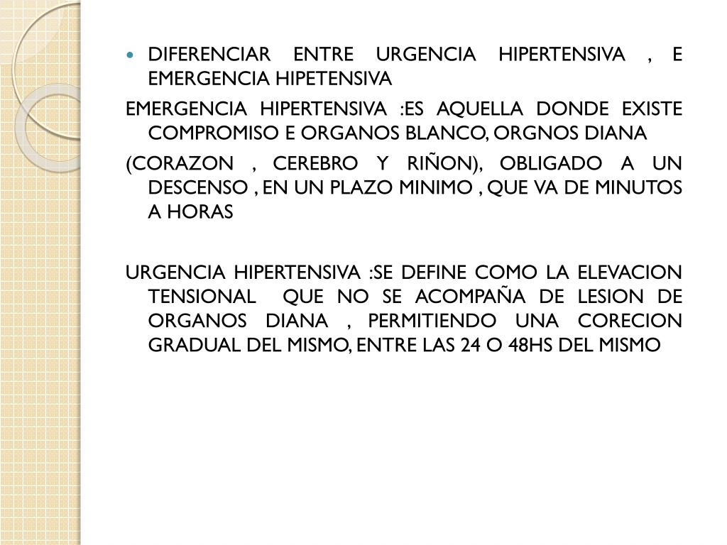 DIFERENCIAR ENTRE URGENCIA HIPERTENSIVA , E EMERGENCIA HIPETENSIVA EMERGENCIA HIPERTENSIVA :ES AQUELLA DONDE EXISTE COMPROMISO E ORGANOS BLANCO, ORGNOS DIANA (CORAZON , CEREBRO Y RIÑON), OBLIGADO A UN DESCENSO , EN UN PLAZO MINIMO , QUE VA DE MINUTOS A HORAS URGENCIA HIPERTENSIVA :SE DEFINE COMO LA ELEVACION TENSIONAL QUE NO SE ACOMPAÑA DE LESION DE ORGANOS DIANA , PERMITIENDO UNA CORECION GRADUAL DEL MISMO, ENTRE LAS 24 O 48HS DEL MISMO