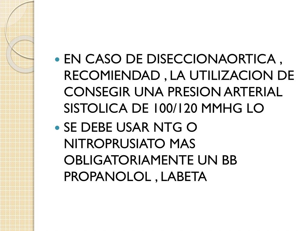 EN CASO DE DISECCIONAORTICA , RECOMIENDAD , LA UTILIZACION DE CONSEGIR UNA PRESION ARTERIAL SISTOLICA DE 100/120 MMHG LO • SE DEBE USAR NTG O NITROPRUSIATO MAS OBLIGATORIAMENTE UN BB PROPANOLOL , LABETA