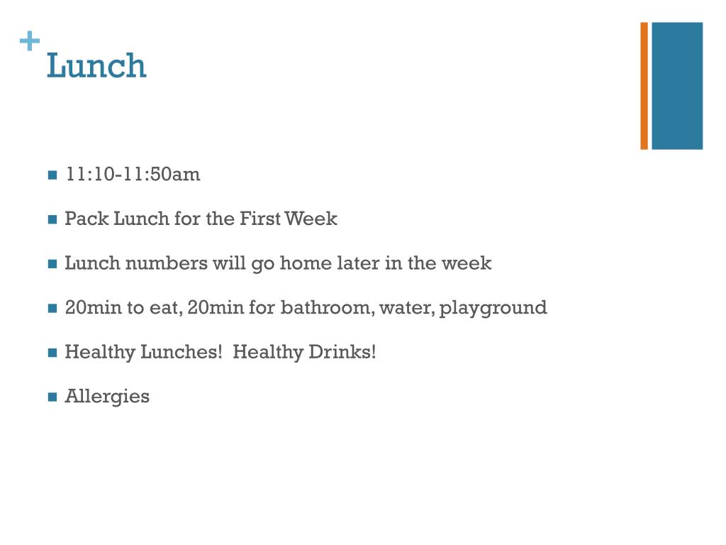 Lunch • 11:10-11:50am • Pack Lunch for the First Week • Lunch numbers will go home later in the week • 20min to eat, 20min for bathroom, water, playground • Healthy Lunches! Healthy Drinks! • Allergies