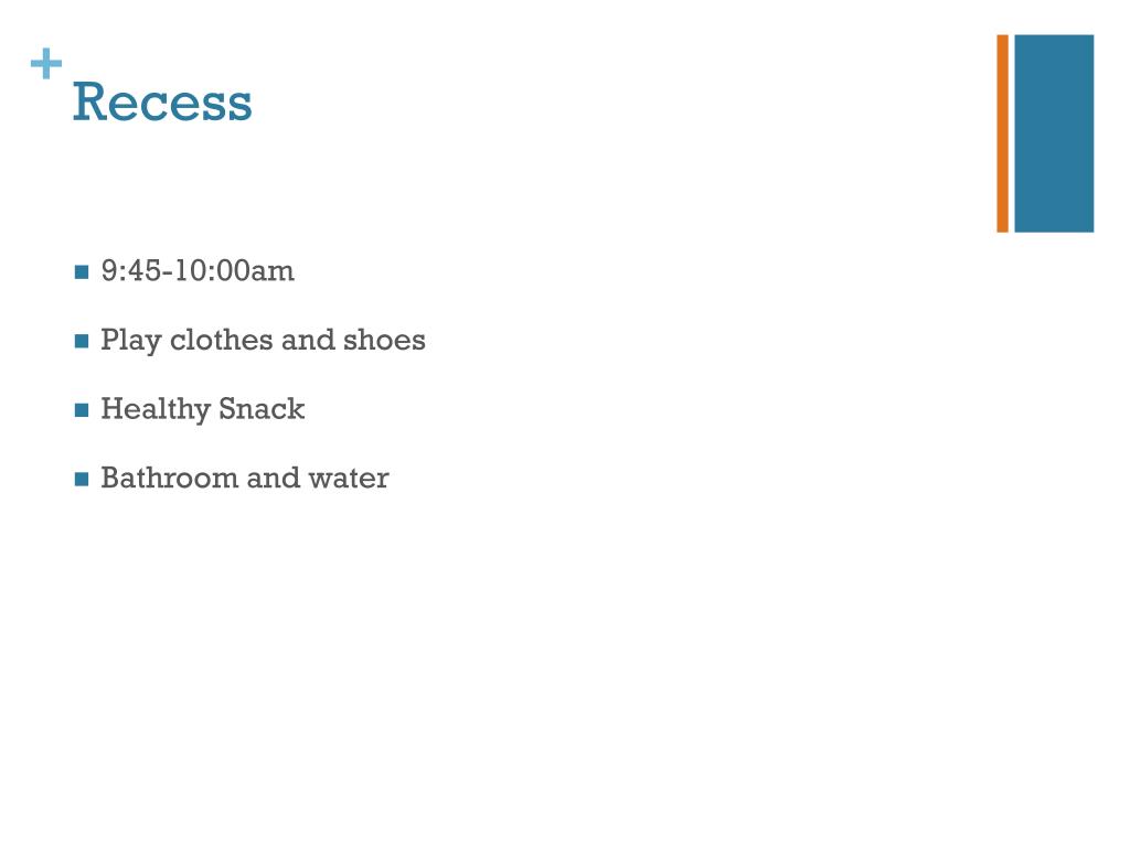 Recess • 9:45-10:00am • Play clothes and shoes • Healthy Snack • Bathroom and water