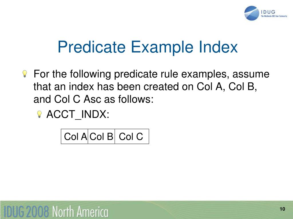 Predicate Example Index • For the following predicate rule examples, assume that an index has been created on Col A, Col B, and Col C Asc as follows: • ACCT_INDX: Col A Col B Col C