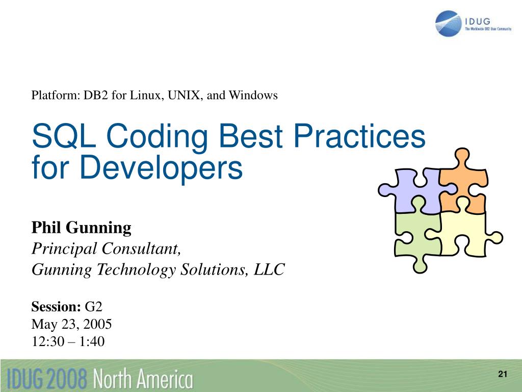SQL Coding Best Practicesfor Developers Platform: DB2 for Linux, UNIX, and Windows Phil Gunning Principal Consultant, Gunning Technology Solutions, LLC Session: G2 May 23, 2005 12:30 – 1:40