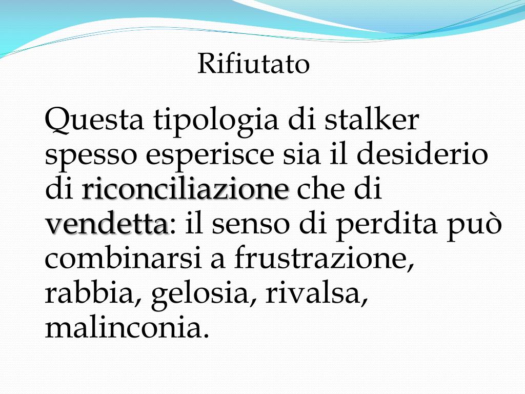 Rifiutato Questa tipologia di stalker spesso esperisce sia il desiderio di riconciliazione che di vendetta: il senso di perdita può combinarsi a frustrazione, rabbia, gelosia, rivalsa, malinconia.
