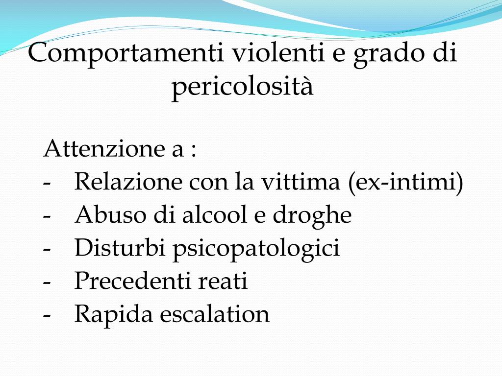 Comportamenti violenti e grado di pericolosità • Attenzione a : • Relazione con la vittima (ex-intimi) • Abuso di alcool e droghe • Disturbi psicopatologici • Precedenti reati • Rapida escalation
