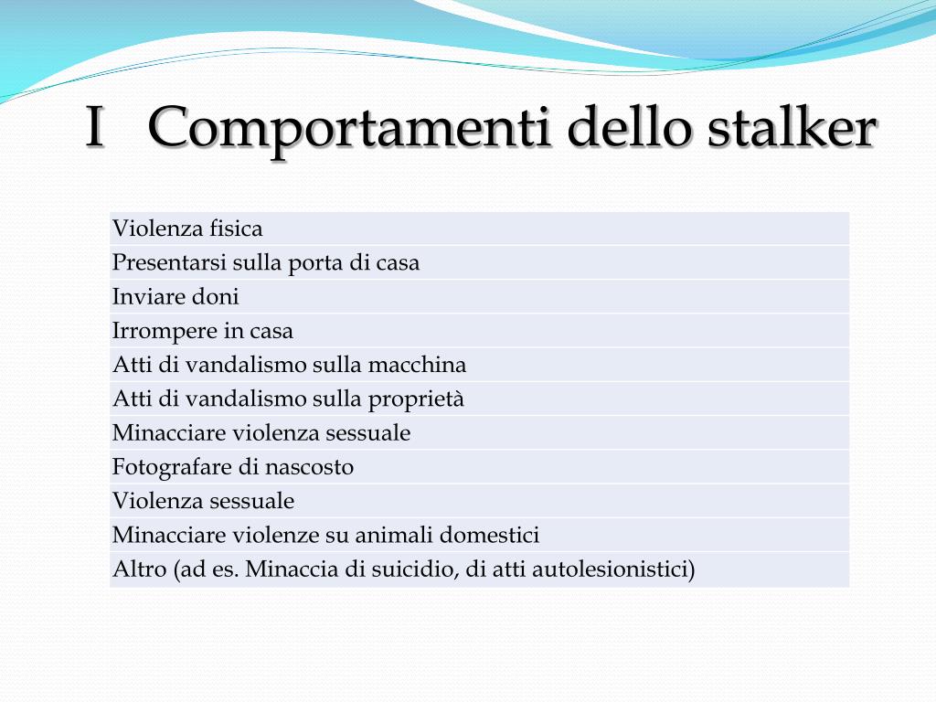 I Comportamenti dello stalker Comunicazioni intrusive (telefonate, lettere, sms, e-mail) Contatti controllo in/diretto (pedinare, spiare…) confronto diretto (minacce, violenza, visite sui luoghi di lavoro)