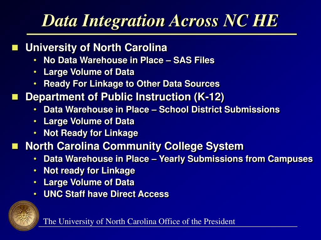 Data Integration Across NC HE • University of North Carolina • No Data Warehouse in Place – SAS Files • Large Volume of Data • Ready For Linkage to Other Data Sources • Department of Public Instruction (K-12) • Data Warehouse in Place – School District Submissions • Large Volume of Data • Not Ready for Linkage • North Carolina Community College System • Data Warehouse in Place – Yearly Submissions from Campuses • Not ready for Linkage • Large Volume of Data • UNC Staff have Direct Access