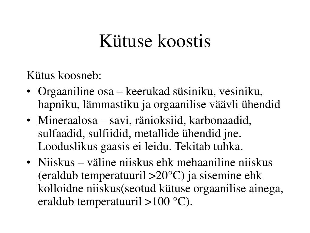 Kütuse koostis Kütus koosneb: • Orgaaniline osa – keerukad süsiniku, vesiniku, hapniku, lämmastiku ja orgaanilise väävli ühendid • Mineraalosa – savi, ränioksiid, karbonaadid, sulfaadid, sulfiidid, metallide ühendid jne. Looduslikus gaasis ei leidu. Tekitab tuhka. • Niiskus – väline niiskus ehk mehaaniline niiskus (eraldub temperatuuril >20°C) ja sisemine ehk kolloidne niiskus(seotud kütuse orgaanilise ainega, eraldub temperatuuril >100 °C).