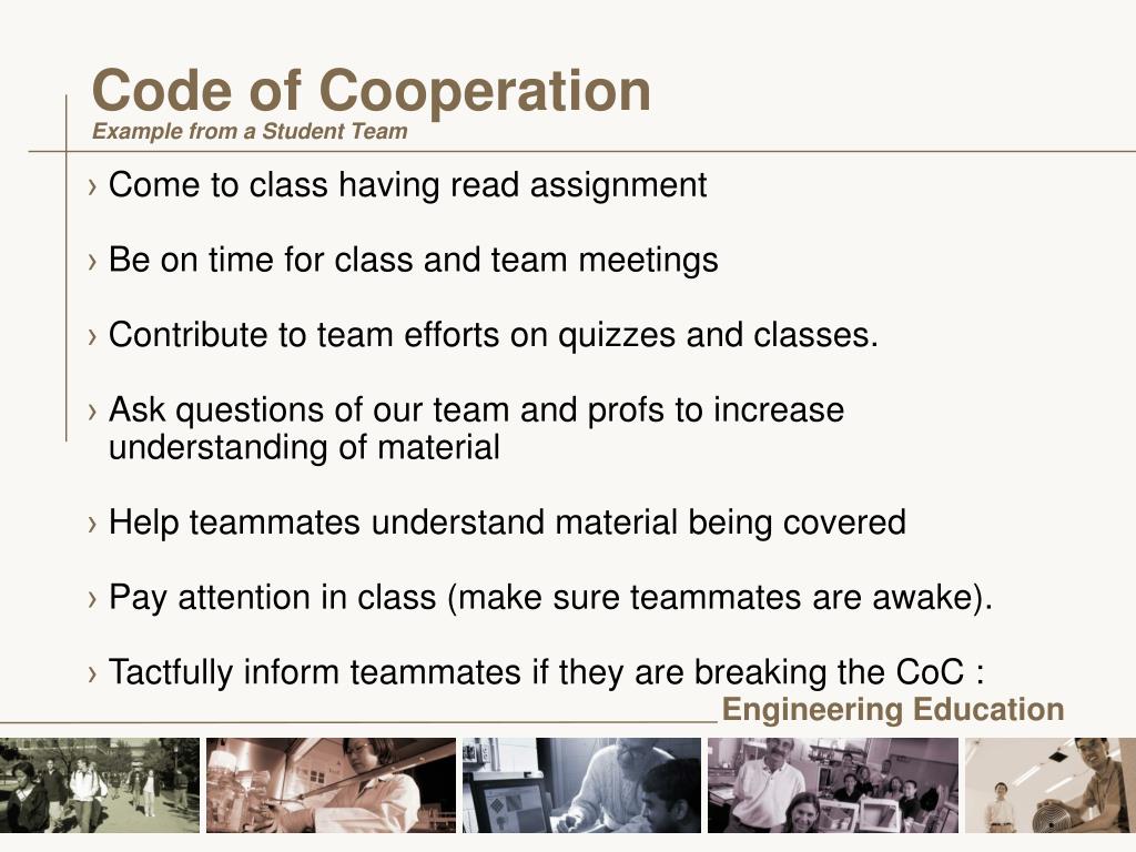 Code of Cooperation The agreed upon rules governing the behavior of team members, as well as any appropriate rewards and sanctions. • It sets a norm for acceptable behavior for each team member and represents how the team members will interact with one another; • It should be developed, adopted, improved and/or modified by all team members on a continuous basis; • It should be easily accessible to team members.