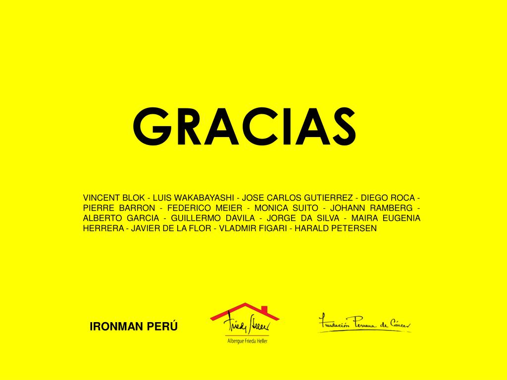 GRACIAS VINCENT BLOK - LUIS WAKABAYASHI - JOSE CARLOS GUTIERREZ - DIEGO ROCA - PIERRE BARRON - FEDERICO MEIER - MONICA SUITO - JOHANN RAMBERG - ALBERTO GARCIA - GUILLERMO DAVILA - JORGE DA SILVA - MAIRA EUGENIA HERRERA - JAVIER DE LA FLOR - VLADMIR FIGARI - HARALD PETERSEN IRONMAN PERÚ