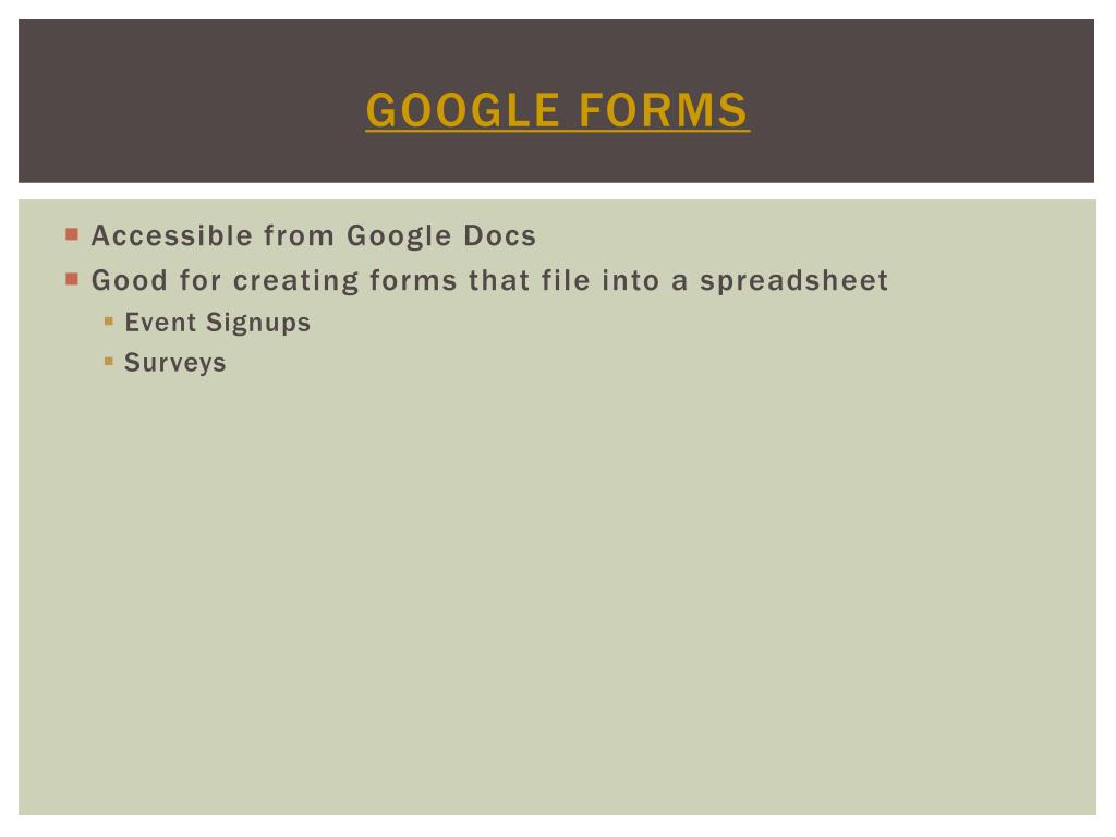 Google forms • Accessible from Google Docs • Good for creating forms that file into a spreadsheet • Event Signups • Surveys
