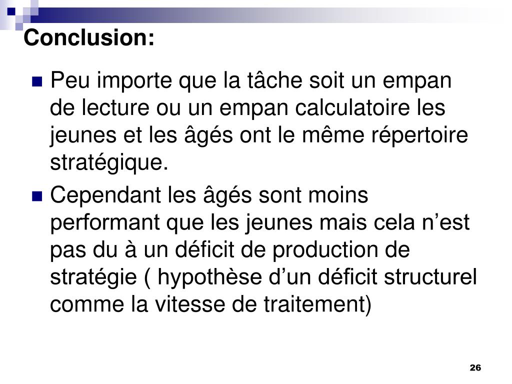 Conclusion: • Peu importe que la tâche soit un empan de lecture ou un empan calculatoire les jeunes et les âgés ont le même répertoire stratégique. • Cependant les âgés sont moins performant que les jeunes mais cela n’est pas du à un déficit de production de stratégie ( hypothèse d’un déficit structurel comme la vitesse de traitement)