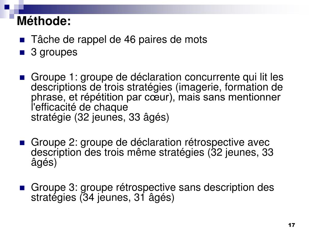 Méthode: • Tâche de rappel de 46 paires de mots • 3 groupes • Groupe 1: groupe de déclaration concurrente qui lit les descriptions de trois stratégies (imagerie, formation de phrase, et répétition par cœur), mais sans mentionner l'efficacité de chaquestratégie (32 jeunes, 33 âgés) • Groupe 2: groupe de déclaration rétrospective avec description des trois même stratégies (32 jeunes, 33 âgés) • Groupe 3: groupe rétrospective sans description des stratégies (34 jeunes, 31 âgés)