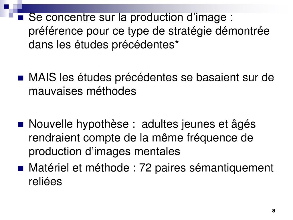 Se concentre sur la production d’image : préférence pour ce type de stratégie démontrée dans les études précédentes* • MAIS les études précédentes se basaient sur de mauvaises méthodes • Nouvelle hypothèse : adultes jeunes et âgés rendraient compte de la même fréquence de production d’images mentales • Matériel et méthode : 72 paires sémantiquement reliées