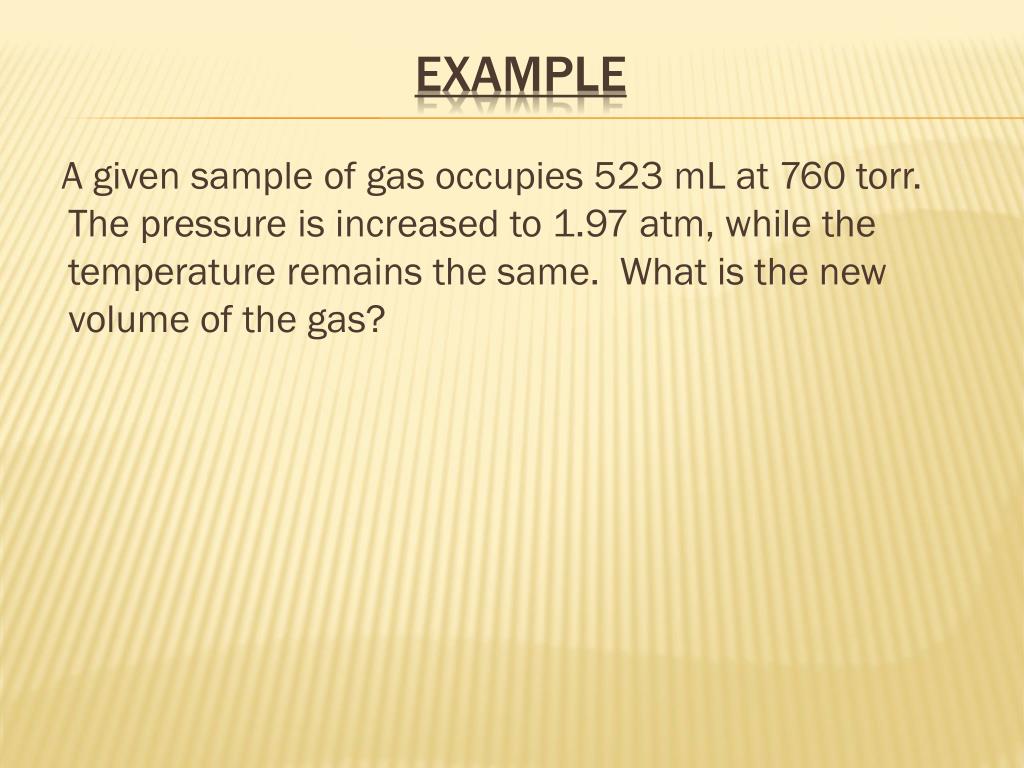 Example A given sample of gas occupies 523 mL at 760 torr. The pressure is increased to 1.97 atm, while the temperature remains the same. What is the new volume of the gas?