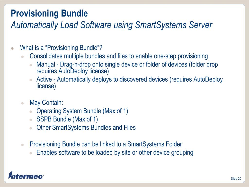 Provisioning BundleAutomatically Load Software using SmartSystems Server • What is a “Provisioning Bundle”? • Consolidates multiple bundles and files to enable one-step provisioning • Manual - Drag-n-drop onto single device or folder of devices (folder drop requires AutoDeploy license) • Active - Automatically deploys to discovered devices (requires AutoDeploy license) • May Contain: • Operating System Bundle (Max of 1) • SSPB Bundle (Max of 1) • Other SmartSystems Bundles and Files • Provisioning Bundle can be linked to a SmartSystems Folder • Enables software to be loaded by site or other device grouping