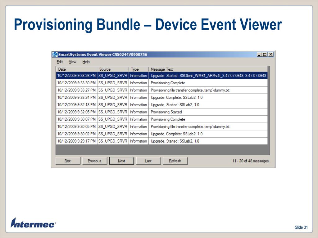 Software Bundle Wizard • Create software bundles to install on Intermec devices • Basic / Advanced Mode • Separate Download / Install • Advanced Operations • Transfer Files • Registry Settings • Local File Manipulation • Start / Stop Processes