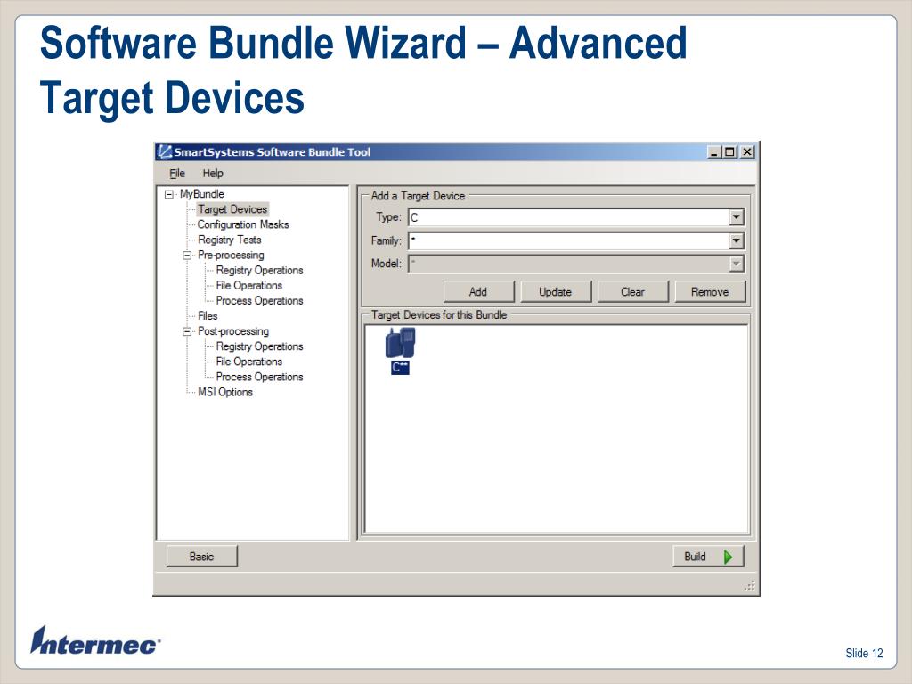 The Smart in SmartSystems. October 14, 2009. Software Bundle Wizard . Create software bundles to install on Intermec devices Basic / Advanced Mode Separate Download / Install Advanced Operations Transfer Files Registry Settings Local File Manipulation Start / Stop Processes .