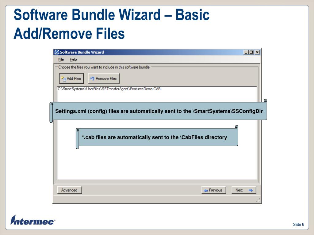 Software Bundle Wizard – BasicAdd/Remove Files Settings.xml (config) files are automatically sent to the \SmartSystems\SSConfigDir *.cab files are automatically sent to the \CabFiles directory