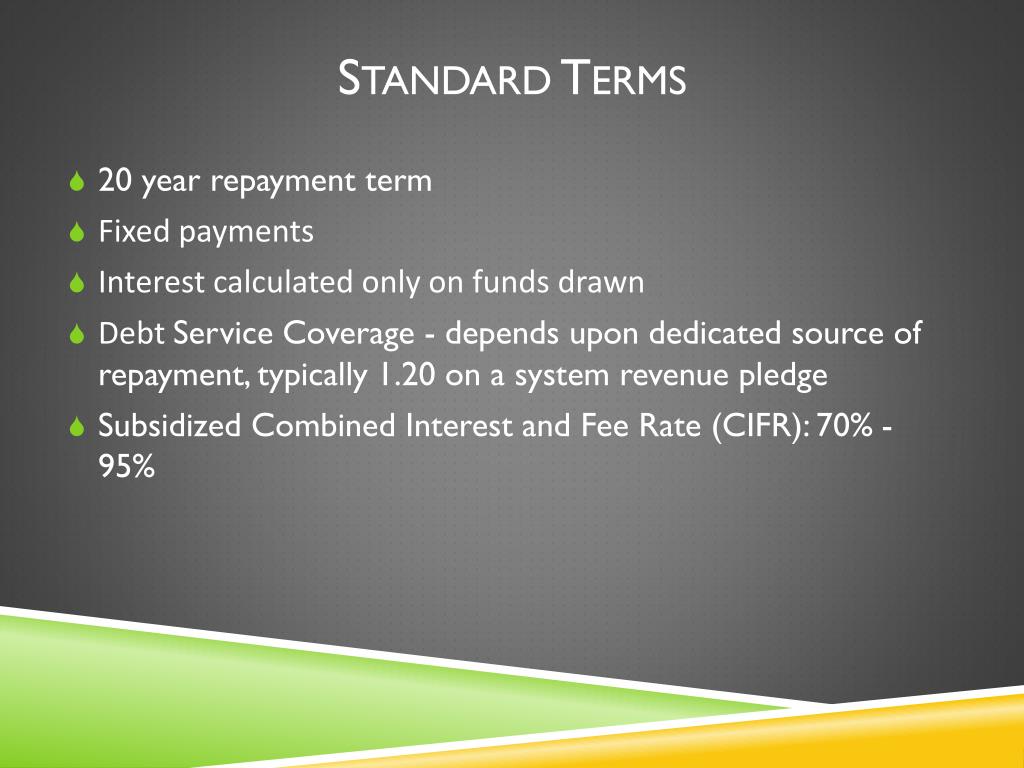 Standard Terms • 20 year repayment term • Fixed payments • Interest calculated only on funds drawn • Debt Service Coverage - depends upon dedicated source of repayment, typically 1.20 on a system revenue pledge • Subsidized Combined Interest and Fee Rate (CIFR): 70% - 95%