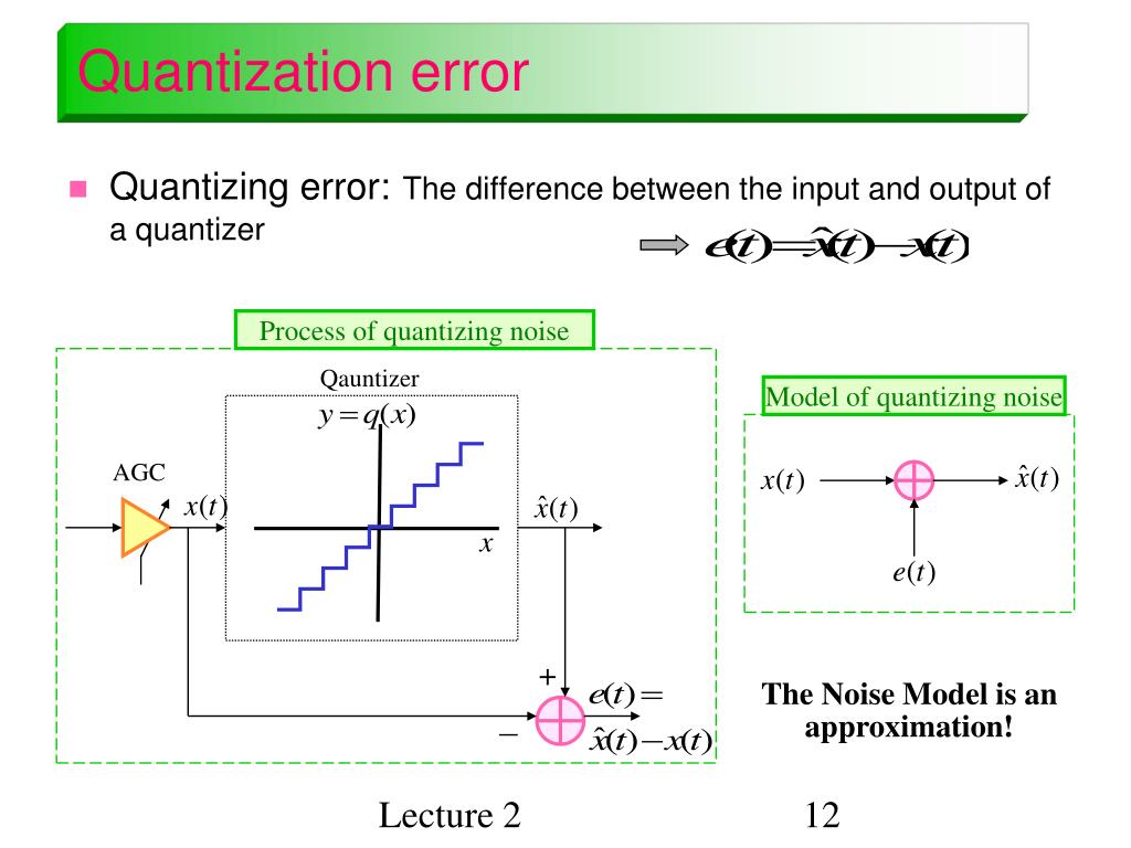 Lecture 2 Quantization error Quantizing error:The difference between the input and output of a quantizer Process of quantizing noise Qauntizer Model of quantizing noise AGC + The Noise Model is an approximation!