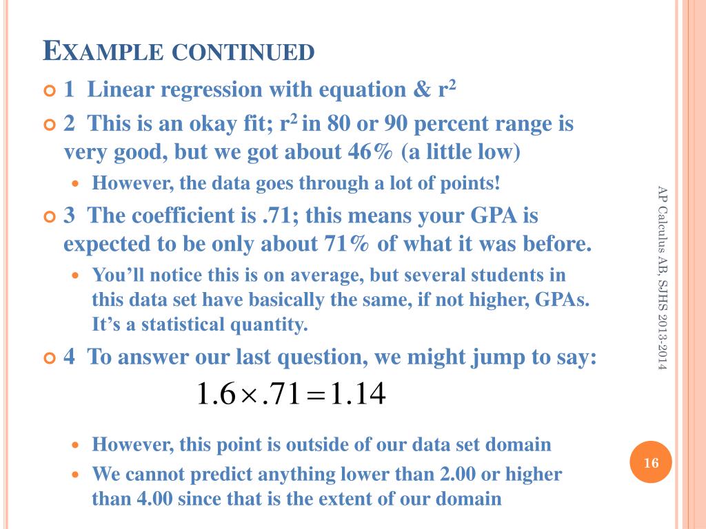 Example continued • 1 Linear regression with equation & r2 • 2 This is an okay fit; r2 in 80 or 90 percent range is very good, but we got about 46% (a little low) • However, the data goes through a lot of points! • 3 The coefficient is .71; this means your GPA is expected to be only about 71% of what it was before. • You’ll notice this is on average, but several students in this data set have basically the same, if not higher, GPAs. It’s a statistical quantity. • 4 To answer our last question, we might jump to say: • However, this point is outside of our data set domain • We cannot predict anything lower than 2.00 or higher than 4.00 since that is the extent of our domain AP Calculus AB, SJHS 2013-2014