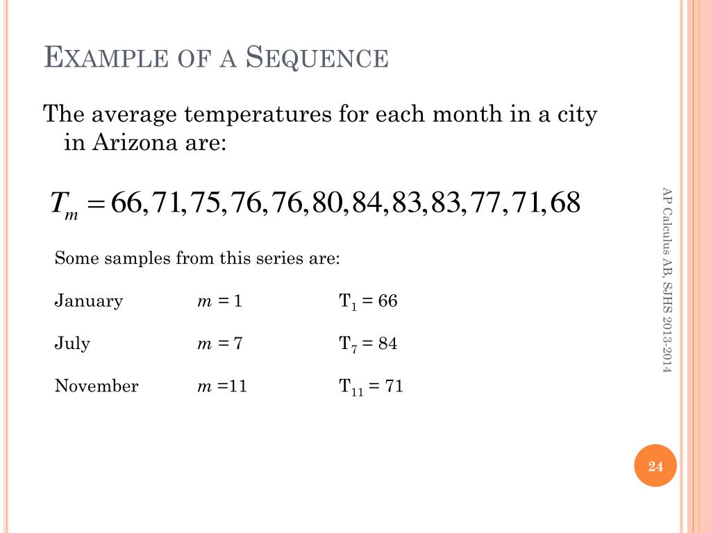 Example of a Sequence The average temperatures for each month in a city in Arizona are: Some samples from this series are: January m = 1 T1 = 66 July m = 7 T7 = 84 November m =11 T11 = 71 AP Calculus AB, SJHS 2013-2014