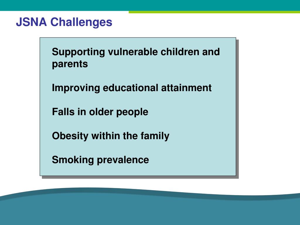 JSNA Challenges Supporting vulnerable children and parents Improving educational attainment Falls in older people Obesity within the family Smoking prevalence