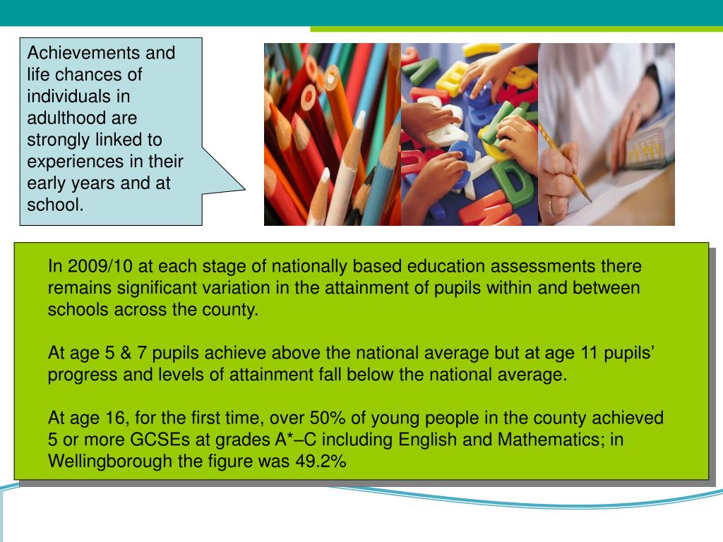 Achievements and life chances of individuals in adulthood are strongly linked to experiences in their early years and at school. In 2009/10 at each stage of nationally based education assessments there remains significant variation in the attainment of pupils within and between schools across the county. At age 5 & 7pupils achieve above the national average but at age 11 pupils’ progress and levels of attainment fall below the national average. At age 16, for the first time, over 50% of young people in the county achieved 5 or more GCSEs at grades A*–C including English and Mathematics; in Wellingborough the figure was 49.2%