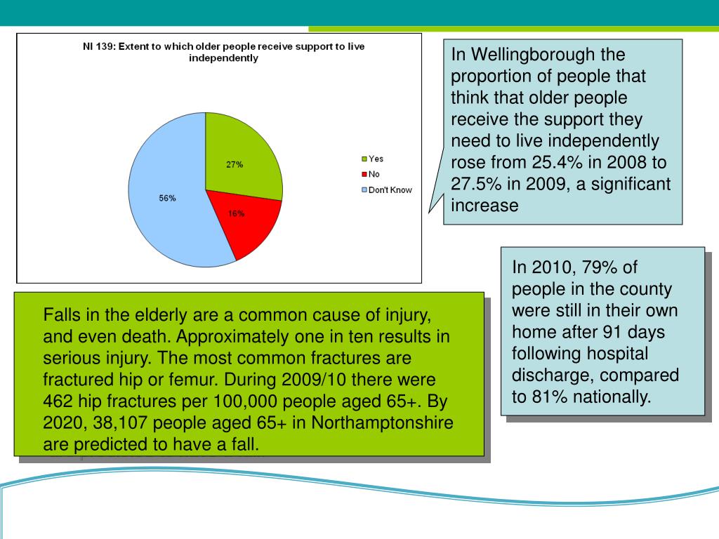 In Wellingborough the proportion of people that think that older people receive the support they need to live independently rose from 25.4% in 2008 to 27.5% in 2009, a significant increase In 2010, 79% of people in the county were still in their own home after 91 days following hospital discharge, compared to 81% nationally. Falls in the elderly are a common cause of injury, and even death. Approximately one in ten results in serious injury. The most common fractures are fractured hip or femur. During 2009/10 there were 462 hip fractures per 100,000 people aged 65+. By 2020, 38,107 people aged 65+ in Northamptonshire are predicted to have a fall.