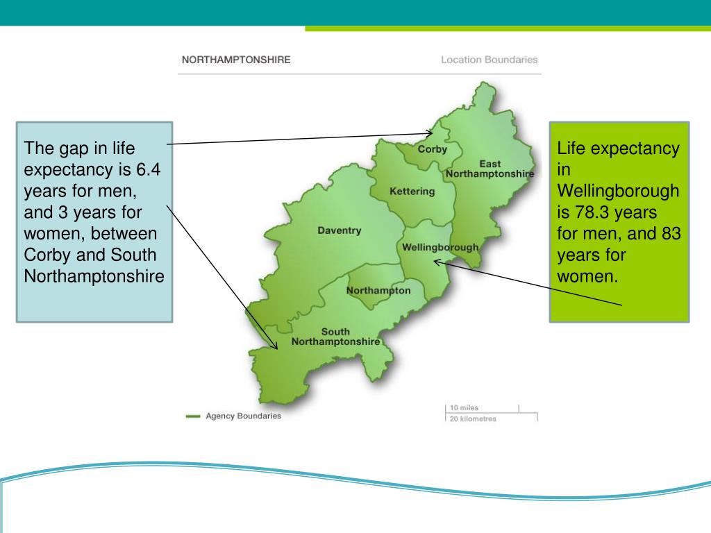 The gap in life expectancy is 6.4 years for men, and 3 years for women, between Corby and South Northamptonshire Life expectancy in Wellingborough is 78.3 years for men, and 83 years for women.