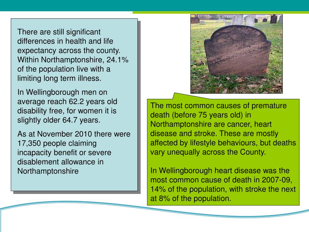 There are still significant differences in health and life expectancy across the county. Within Northamptonshire, 24.1% of the population live with a limiting long term illness. In Wellingborough men on average reach 62.2 years old disability free, for women it is slightly older 64.7 years. As at November 2010 there were 17,350 people claiming incapacity benefit or severe disablement allowance in Northamptonshire The most common causes of premature death (before 75 years old) in Northamptonshire are cancer, heart disease and stroke. These are mostly affected by lifestyle behaviours, but deaths vary unequally across the County. In Wellingborough heart disease was the most common cause of death in 2007-09, 14% of the population, with stroke the next at 8% of the population.