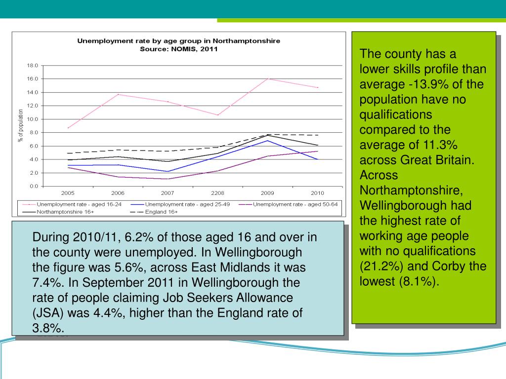 The county has a lower skills profile than average -13.9% of the population have no qualifications compared to the average of 11.3% across Great Britain. Across Northamptonshire, Wellingborough had the highest rate of working age people with no qualifications (21.2%) and Corby the lowest (8.1%). During 2010/11, 6.2% of those aged 16 and over in the county were unemployed. In Wellingborough the figure was 5.6%, across East Midlands it was 7.4%. In September 2011 in Wellingborough the rate of people claiming Job Seekers Allowance (JSA) was 4.4%, higher than the England rate of 3.8%.