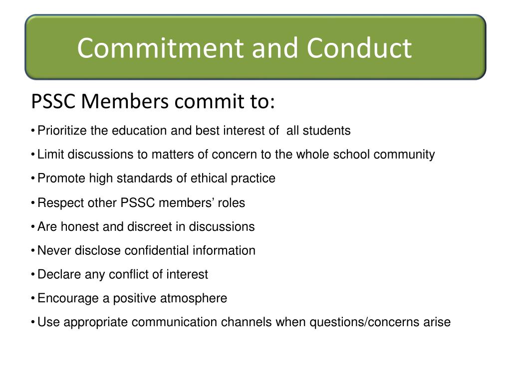 Commitment and Conduct PSSC Members commit to: • Prioritize the education and best interest of all students • Limit discussions to matters of concern to the whole school community • Promote high standards of ethical practice • Respect other PSSC members’ roles • Are honest and discreet in discussions • Never disclose confidential information • Declare any conflict of interest • Encourage a positive atmosphere • Use appropriate communication channels when questions/concerns arise