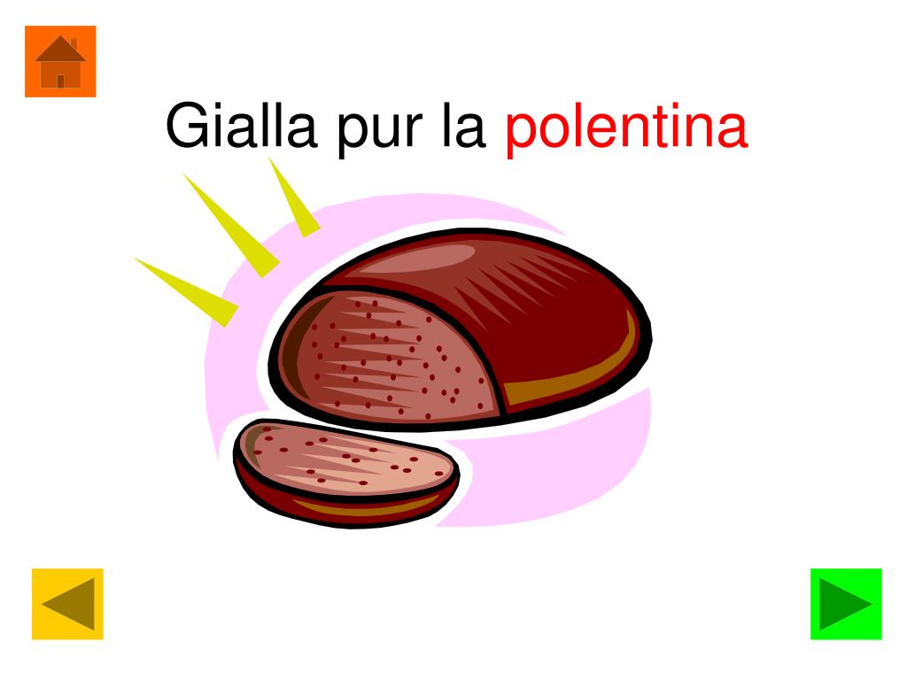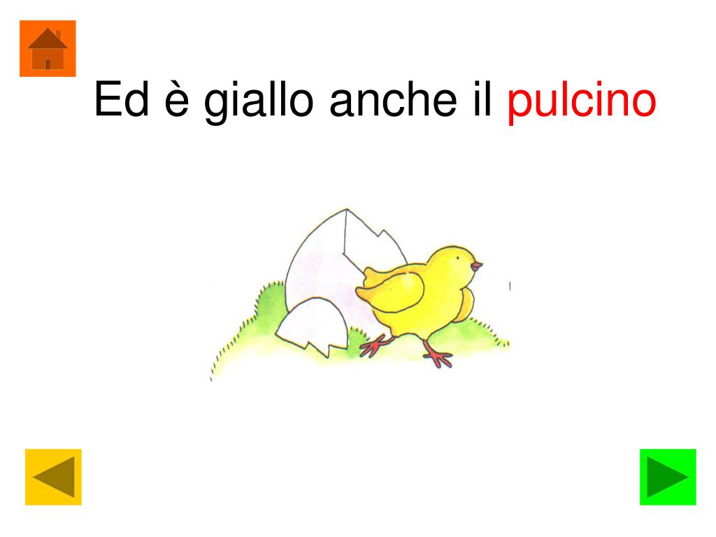 Giallo è il sole stamattina. Gialla pur la polentina. Tutto giallo è il cinesino. Ed è giallo anche il pulcino. Il gelato di limone. E la polpa del melone. Giallo pure è il mio pallone. Ed un foglio di cartone. Giallo il mio pappagallino. E il berretto del fantino.