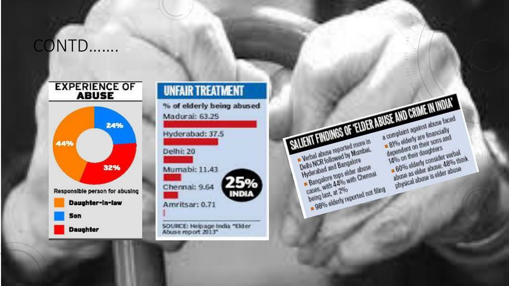 National real life stories “I have been fed up of mistreatment by my daughter-in-law with me. She treats me like with a servant and abuses me verbally. I left my home for many occasions but every time I returned for my sons and grandchildren. I suffer a lot in old age only for sake of my sons & grandchildren.” Noor Bano Begum, 77, Ahmadnager, Maharashtra. “My son & daughter-in-law, both are working. I have to look after my grown-up grandchildren all the time. My son & his wife don’t allow me to go out of home, even when they are at home. After death of my husband I am being marginalized in my own house. Sometimes it seems that I am not the owner of the house, but a care-taker.” PremwatiVerma, 75-year-old widow, Kanpur,